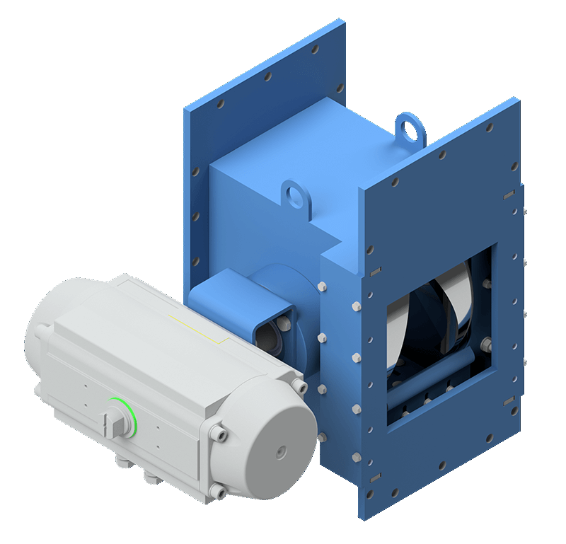 The flow control valve can be controlled pneumatically as well as with geared motor, and any possible opening angle can be achieved via an attached positioner control unit.